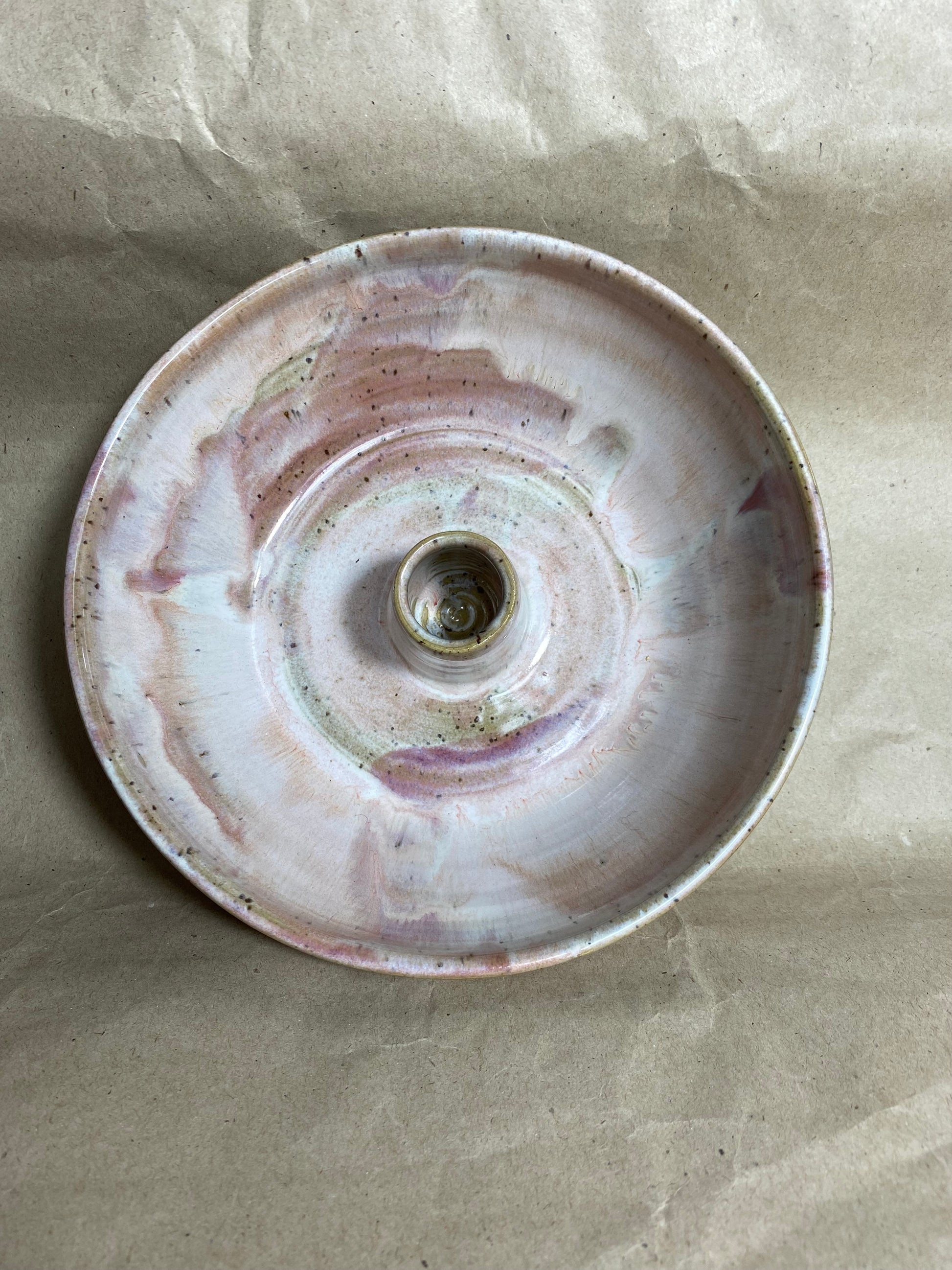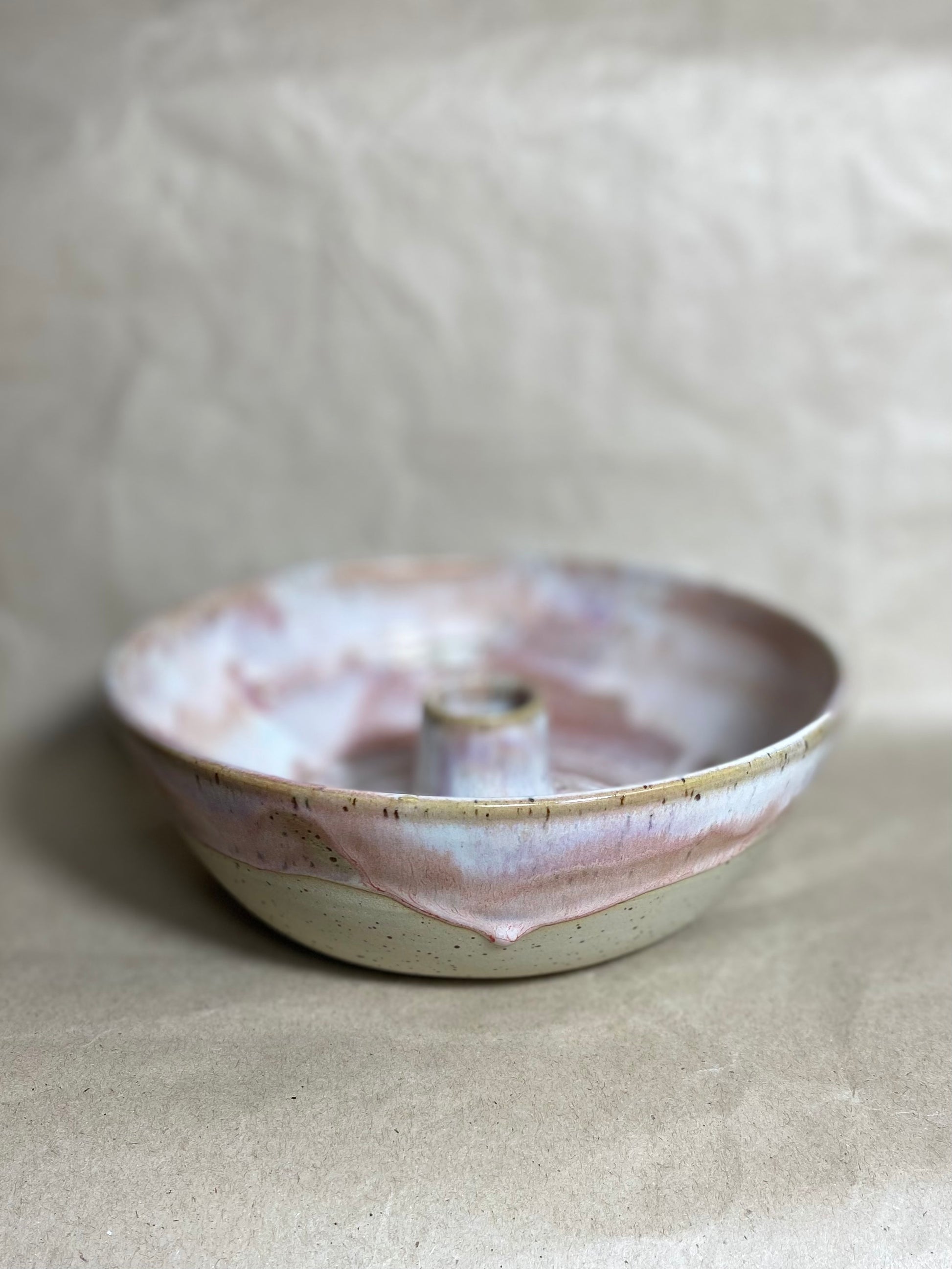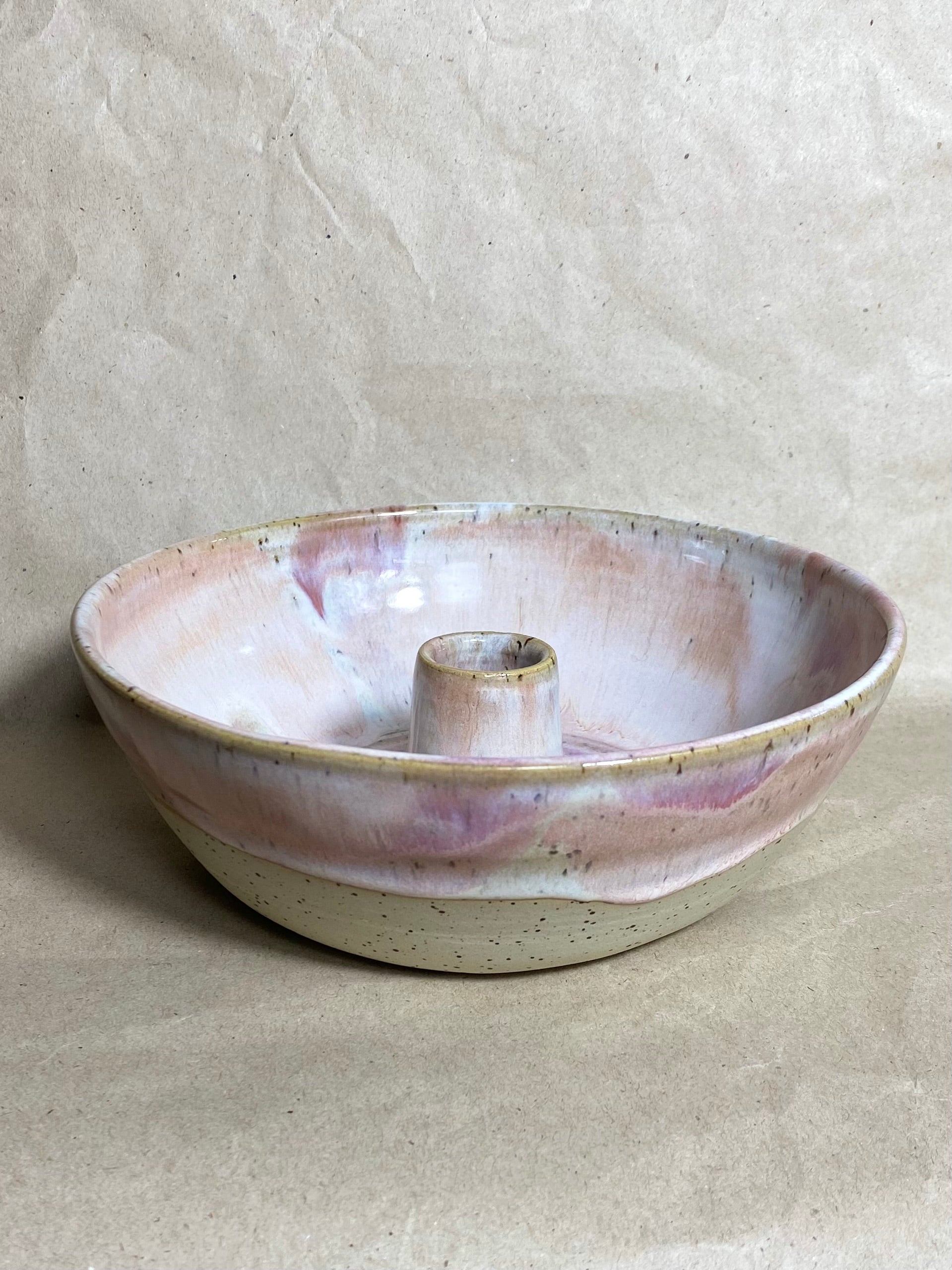 Kerzenhalter aus weißem Steinzeugton mit Spots, hergestellt in liebevoller Handarbeit.